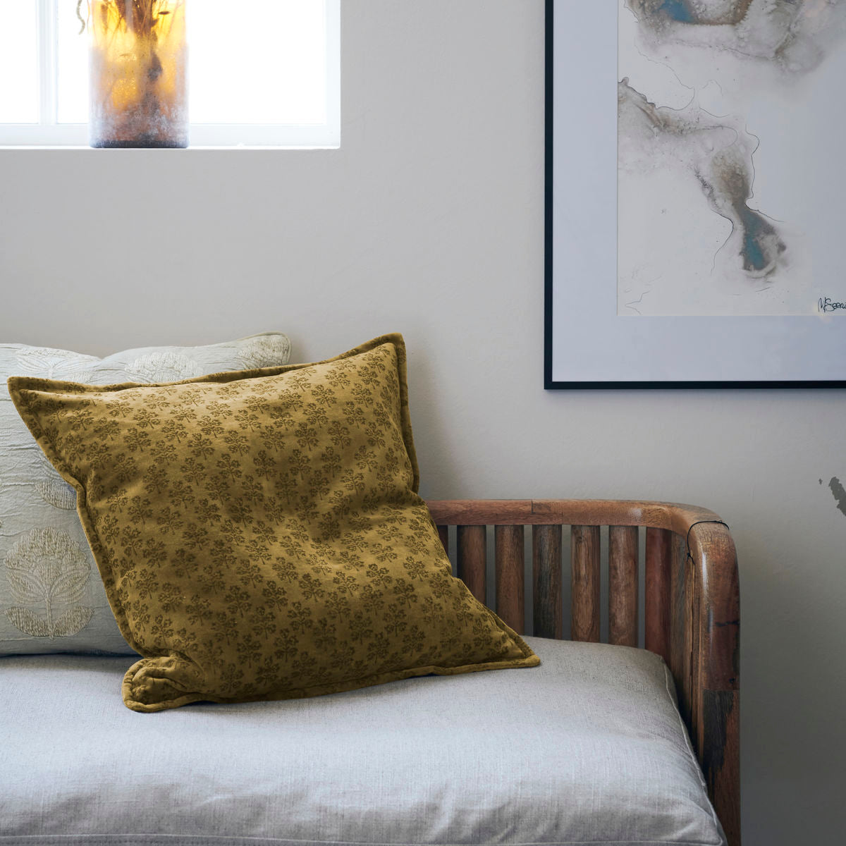 Add a touch of sophistication to your space with this stunning motif cushion in a soft golden mustard hue. Designed to combine style and comfort, this cushion features a repeat leaf pattern and high-quality cotton velvet fabric, making it an ideal accessory for your living room, bedroom, or favourite reading nook. Whether used as a statement piece or layered with other cushions, it’s a versatile and timeless addition to any interior.