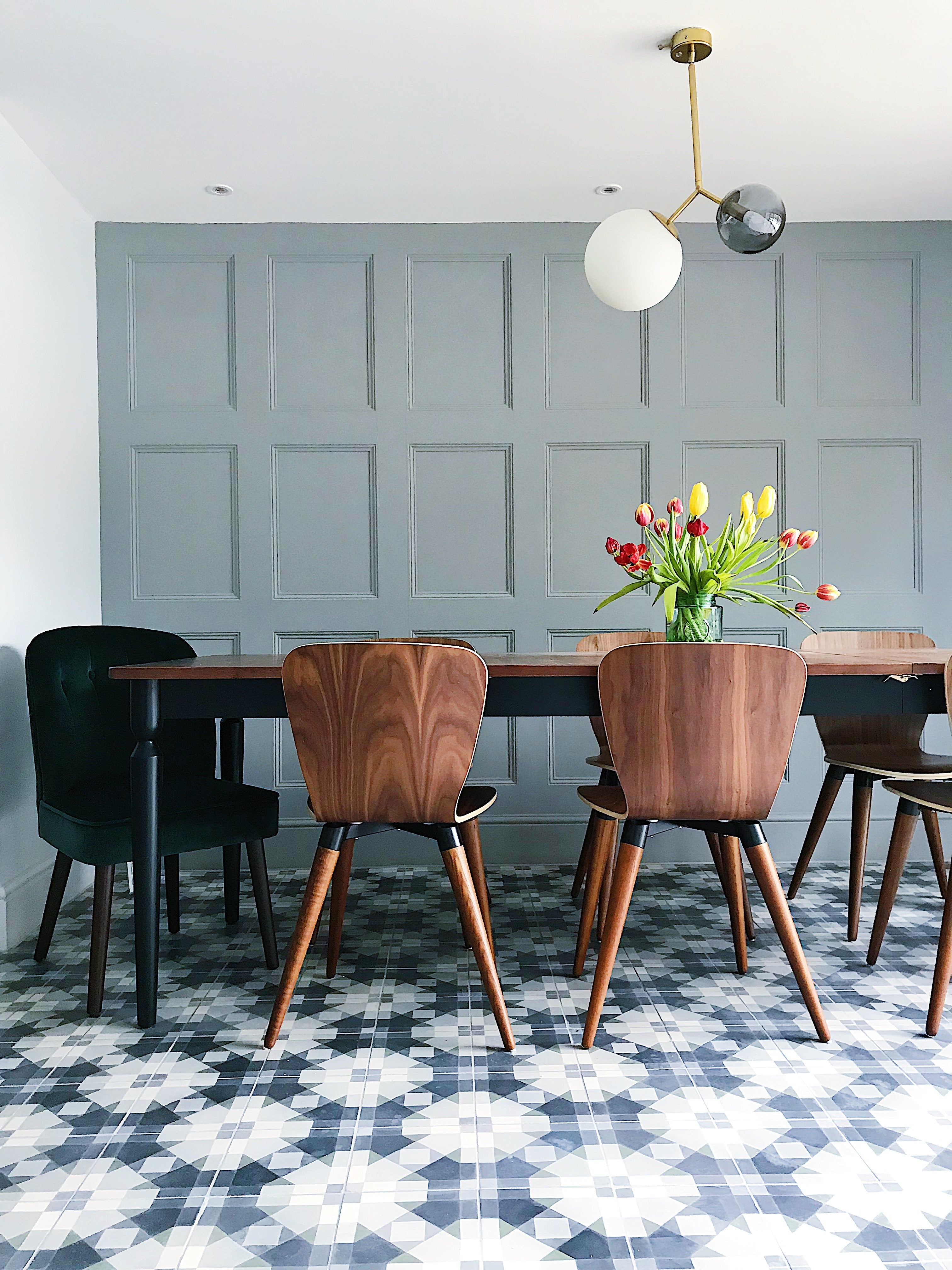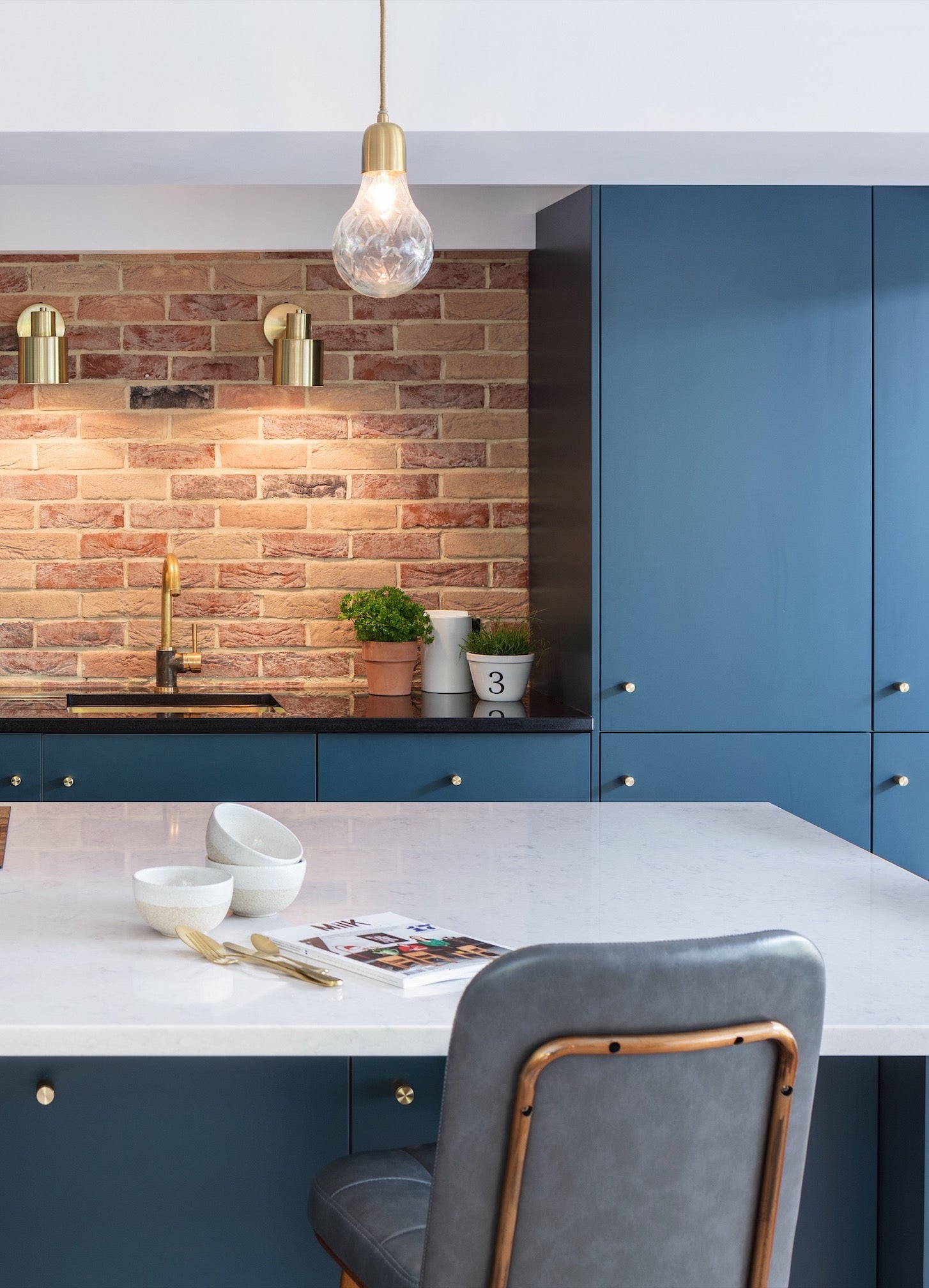 A new extension with kitchen, dining and living space was created with our design packages. We assisted the client in achieving a luxurious custom finish to their kitchen using cost-effective Ikea frames paired with custom doors in Farrow & Ball Hague Blue and knurled brass handles by Buster & Punch.