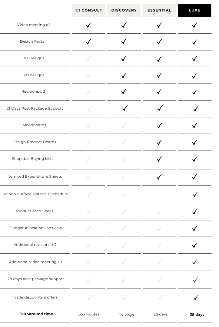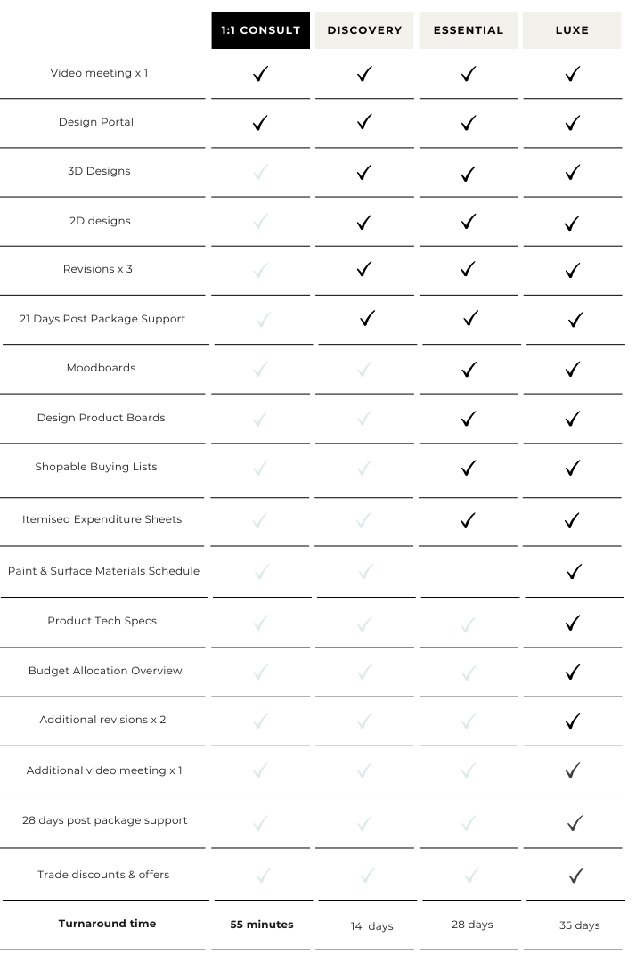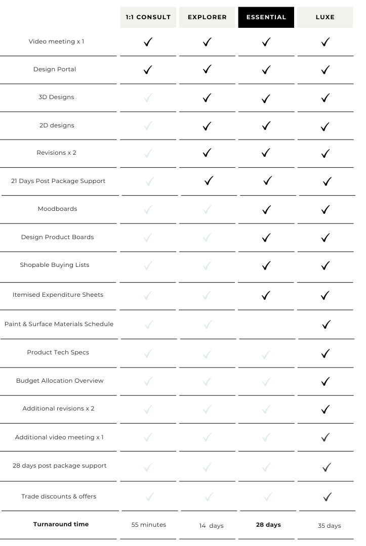 Elevate your living space with our online Interior Design Packages. Whether you're diving into a new project or seeking expert assistance during the process, our packages are customized to suit your individual interior design style and aesthetic. Explore design packages below and see sample projects here.