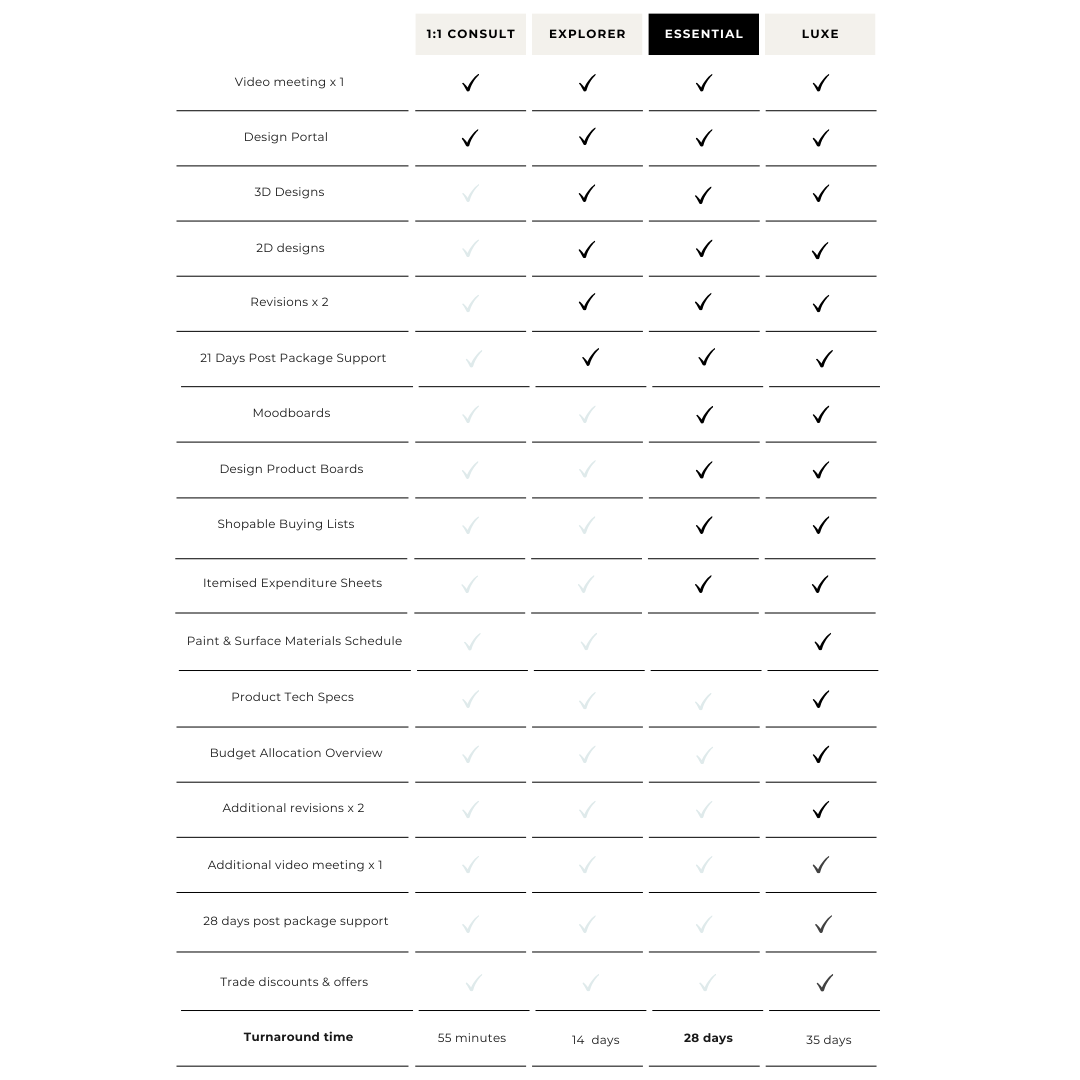 - Comprehensive package of custom interior designs completed in just 28 days from the start date of package.