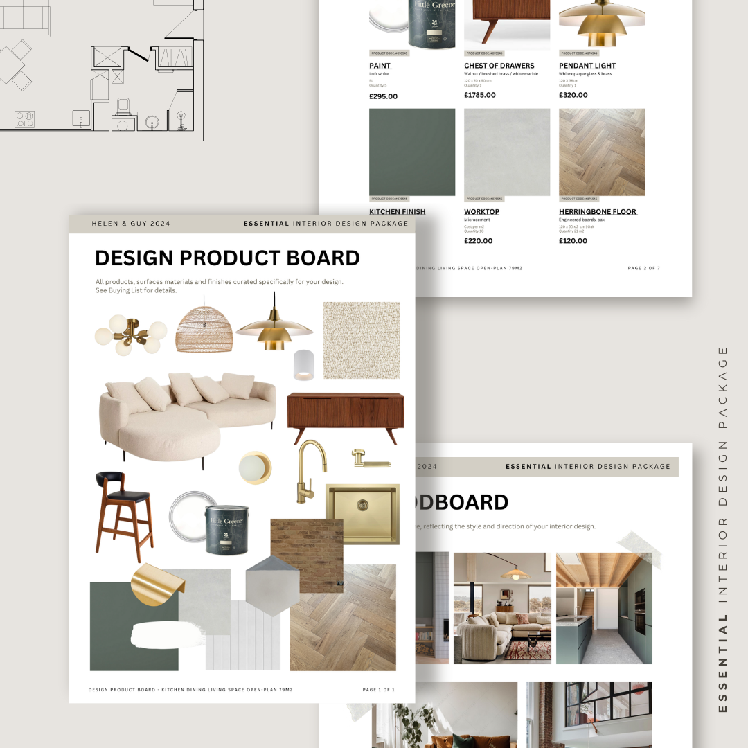 Essential Interior Design Package includes mood boards, design product boards, 3D models, 2D plans, shopable buying lists - everything you need to kick-start your project and create high-quality interior designs.