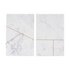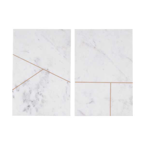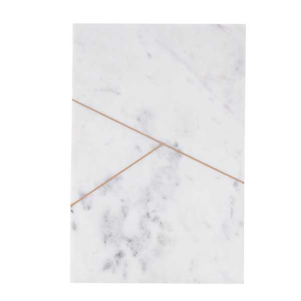 Stylish white marble plate with graphic print in brass. Use this plate as a serving board, a trivet for hot dishes, or as a decorative detail and style with candles or planters. Also available with a different brass design (style 2).